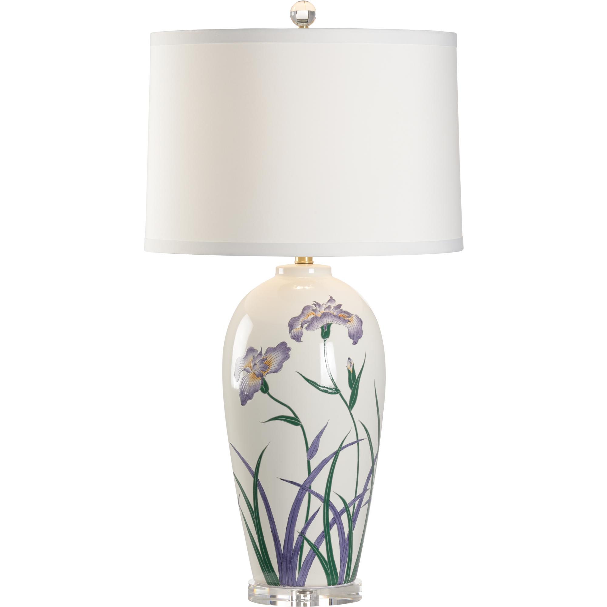 Ruth’s garden lamp features a colorful, hand painted iris design on a traditional ceramic silhouette. Antique brass parts, acrylic base and finial provide a contemporary feel to the classic style. Topped with an off white, silk drum shade, this table lamp brings charm and ambiant light to any decor.