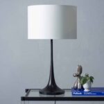 A strong and sleek design. The table lamp is anchored with a black marble tulip shaped base. The off-white cotton shade adds lightness to overall appeal.