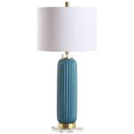 Whether at home or in the office, Samuel ceramic lamp is a contemporary look that can transform your room. This 30″ table lamp is crafted of glazed fluted ceramic. The smooth curves of the ceramic contrast with the straight lines of the clear crystal base while the warm brass accents pull the design together. It is topped with a classic off white linen drum shade to diffuse light throughout your space. Available in multiple colors.