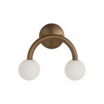 A stylish choice for contemporary interiors, this double-light wall sconce will bring a whimsical touch to your project. Its two white etched globes are suspended from a dark brushed brass-plated iron fixture, delivering an airy aesthetic and modern vibe anywhere you feature it. Perfect for pairing up or showcasing solo.