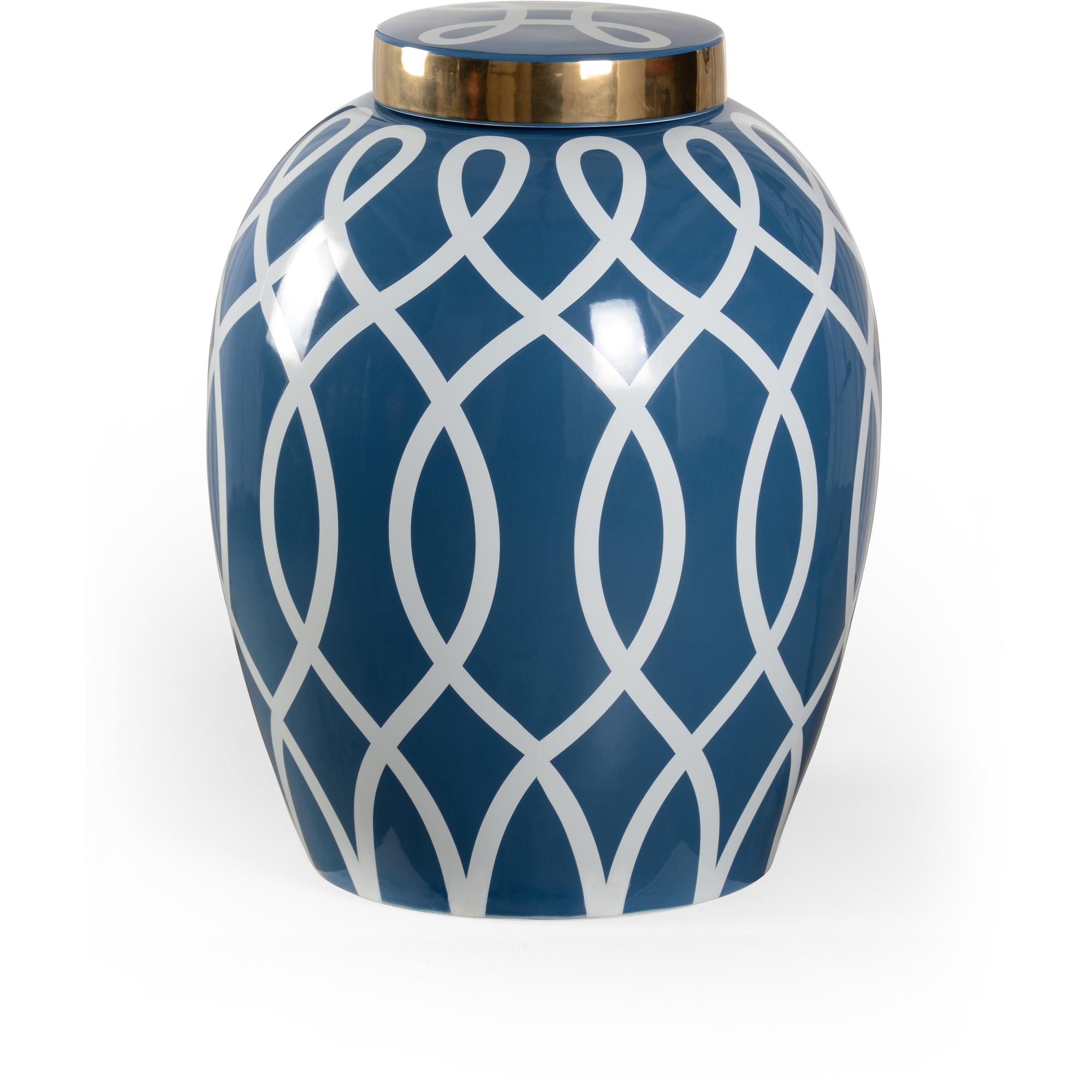 A midsize ginger jar featuring an elongated graceful geometric design in metallic satin gold with a coordinating lid detail. Available in a variety of colors. Designed by Shayla Copas.