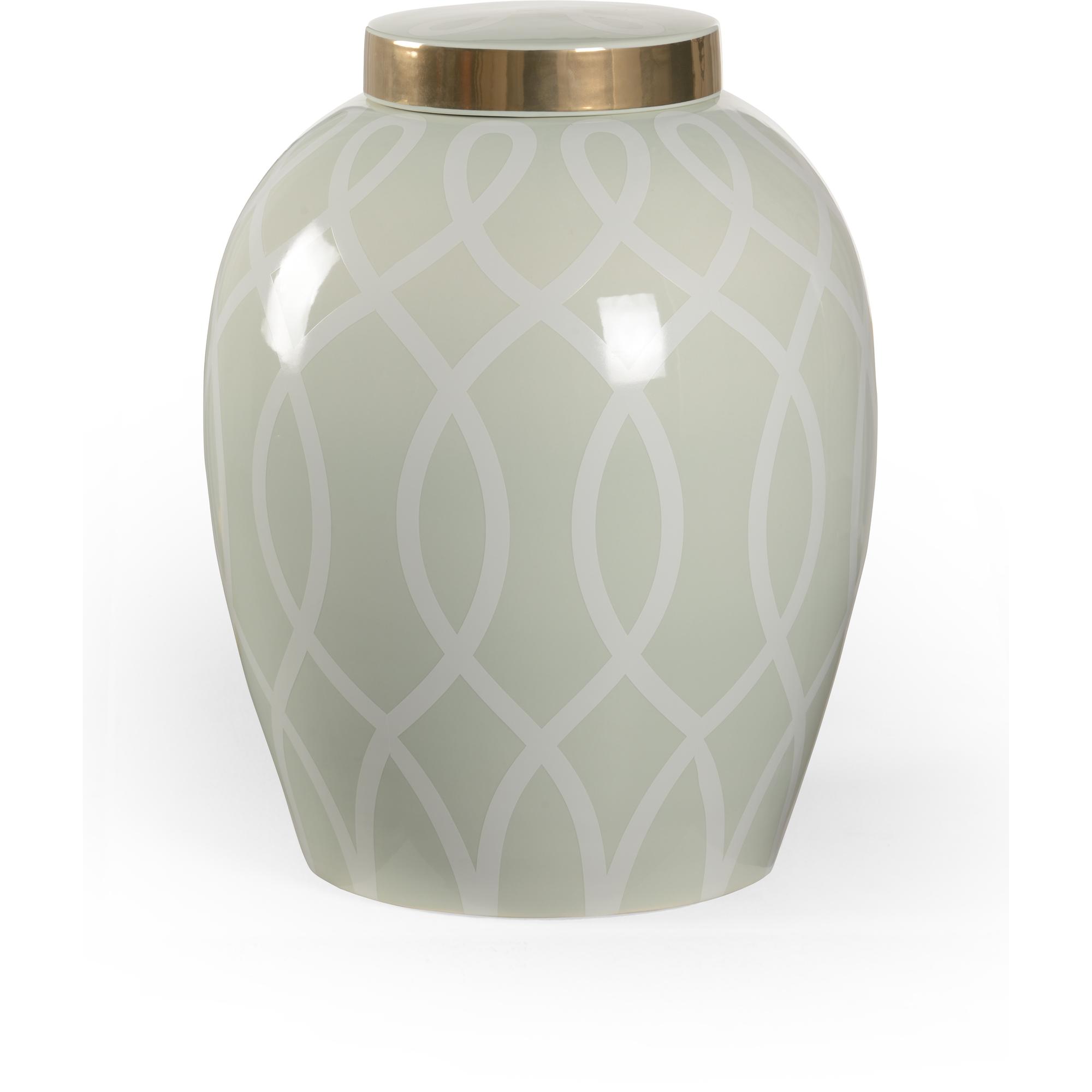 A midsize ginger jar featuring an elongated graceful geometric design in metallic satin gold with a coordinating lid detail. Available in a variety of colors. Designed by Shayla Copas.