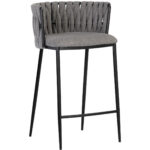 Bold and unconventional, this contemporary counter stool features an eye-catching design that will bring drama to any space. Crafted with a unique weaved backrest that is upholstered in our belfast heather grey and koala grey fabrics. Completed with black powder coated steel frame in a smooth finish.
