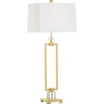 The Serene Table Lamp is a tall, rectangular shape with an open form and acrylic rectangular base. Topped with a white rectangular shade and finished in a metallic gold, it’s a beautiful accent for a modern home.