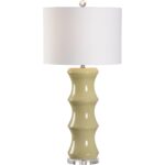 Distinctive ceramic lamp in soft glossy green on a clear acrylic base. Designed by Jamie Merida.