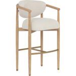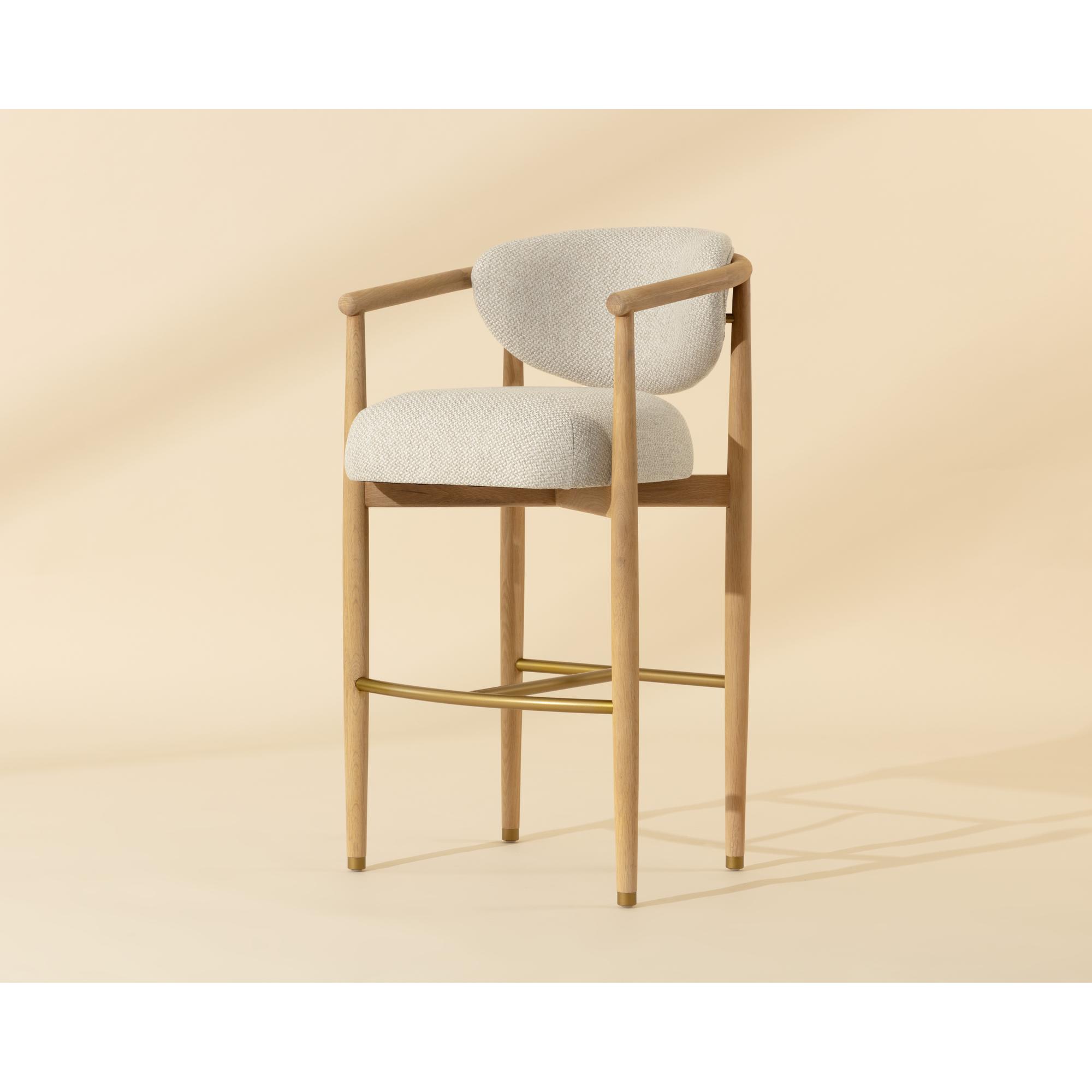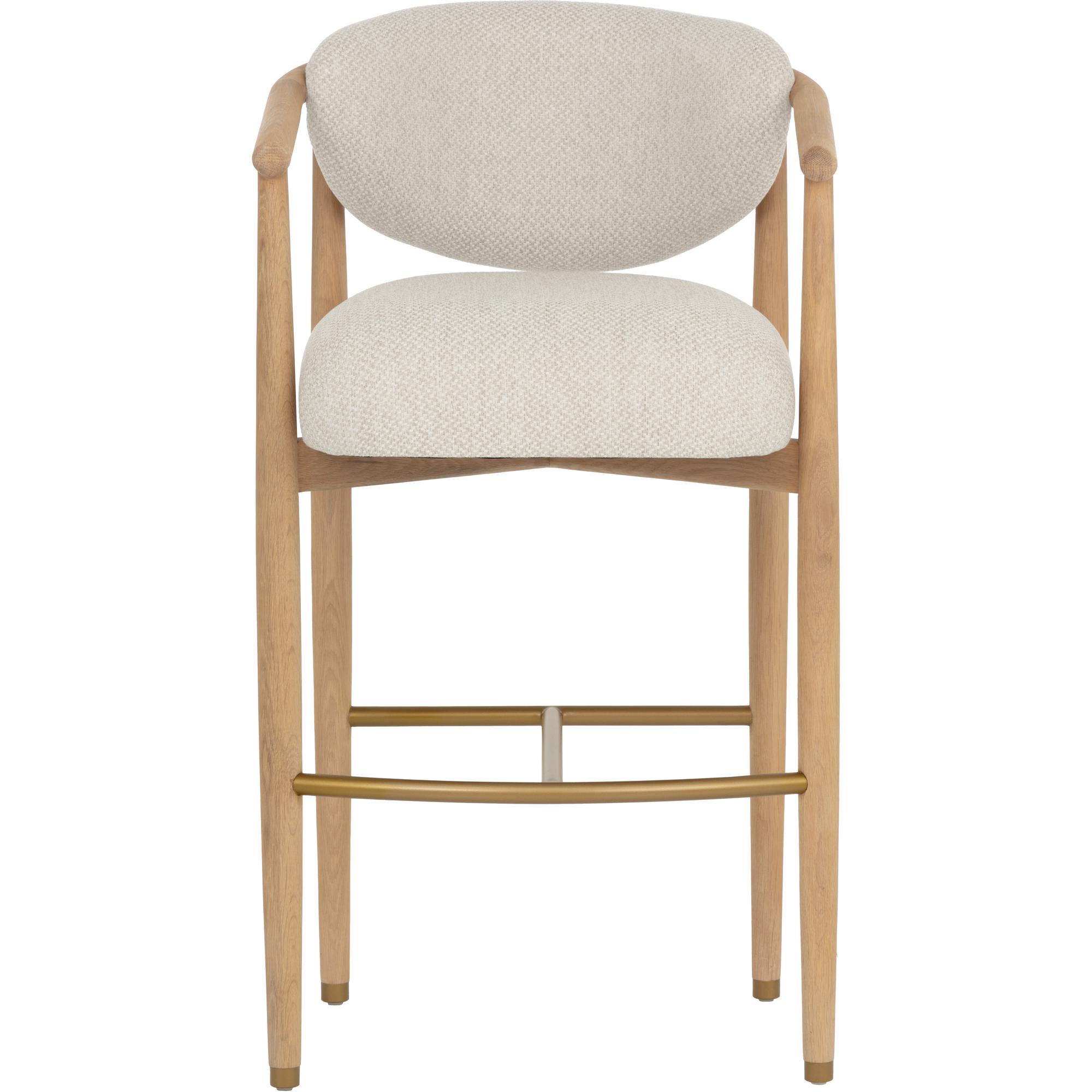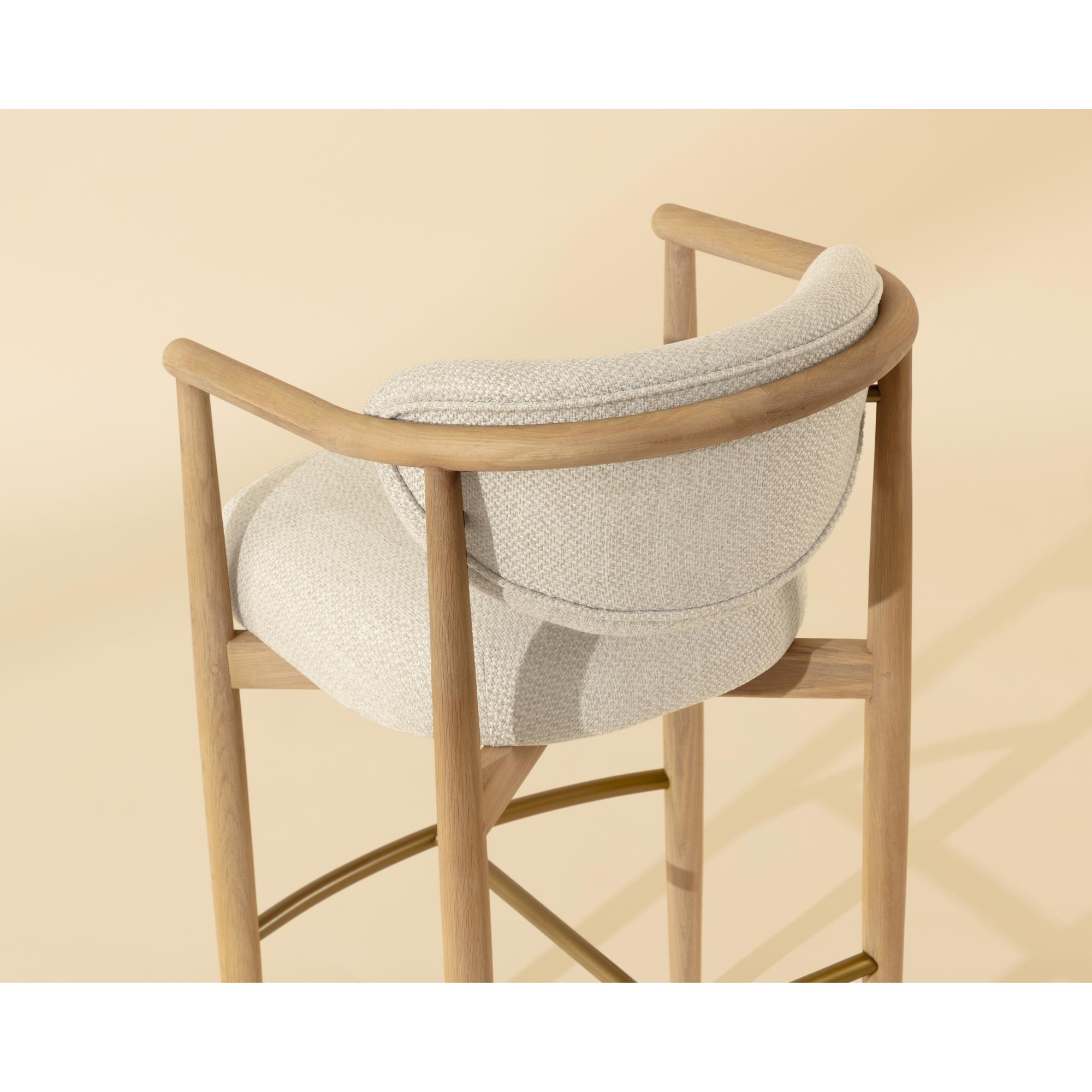 A study in poise and proportion, the Sigrid Barstool is designed for gathering in ease. Its rounded oak frame wraps gracefully around soft, stone-hued upholstery. A stainless steel stretcher and feet caps complete the frame, adding a beautiful contrast against the warmth of the oak.