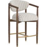 A study in poise and proportion, the Sigrid Counter Stool is designed for gathering in ease. Its rounded dark oak frame wraps gracefully around striped, gifford script fabric upholstery. A stainless steel stretcher and feet caps complete the frame, adding a beautiful contrast against the warmth of the oak.