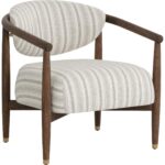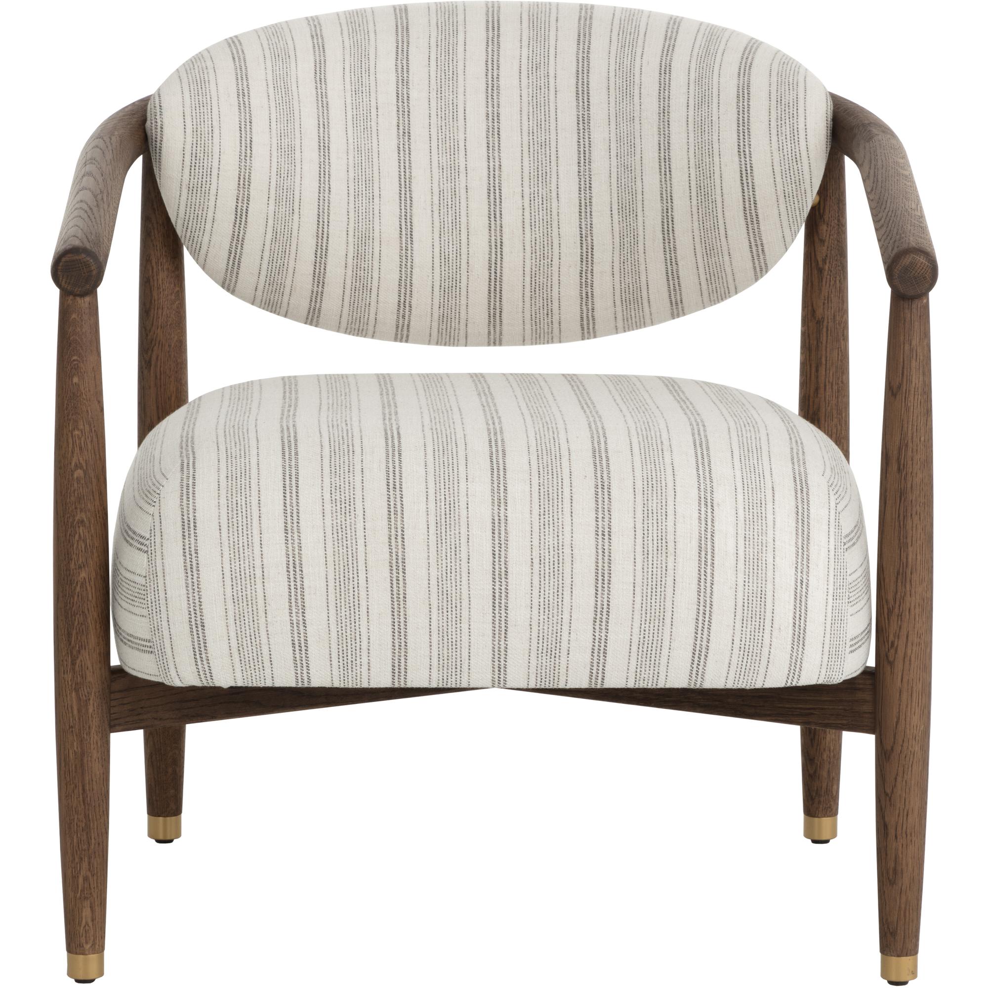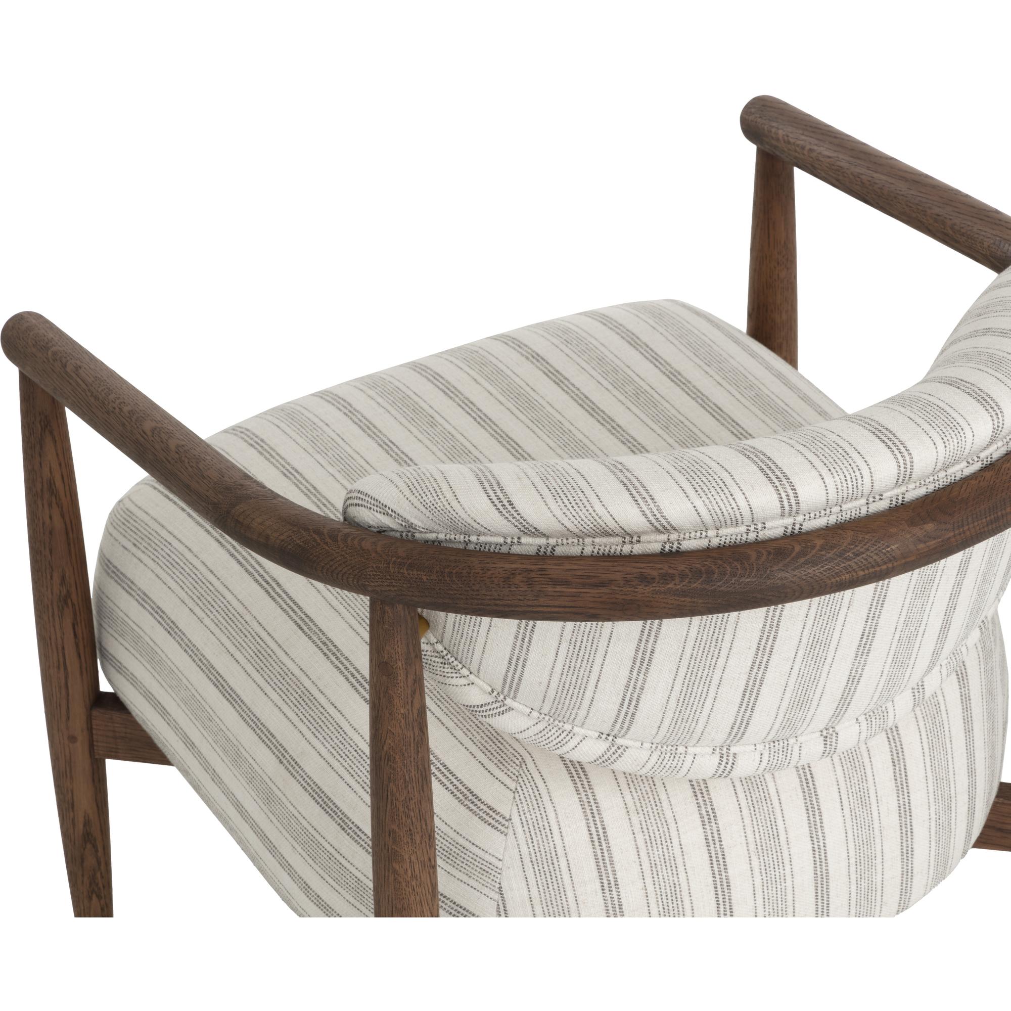 A study in poise and proportion, the Sigrid Barstool is designed for gathering in ease. Its rounded dark oak frame wraps gracefully around striped, gifford script fabric upholstery. A stainless steel stretcher and feet caps complete the frame, adding a beautiful contrast against the warmth of the oak.
