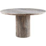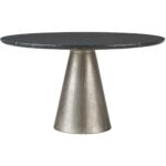The Slate Dining Table captivates with its imaginative design, marrying the sleekness of a Black Merino stone top with the geometric intrigue of a pyramid-shaped base in Antique Silver cast aluminum. This combination creates a piece that is not only visually striking but also carries a hint of glamour, making it a standout, reflective centerpiece in any dining setting.