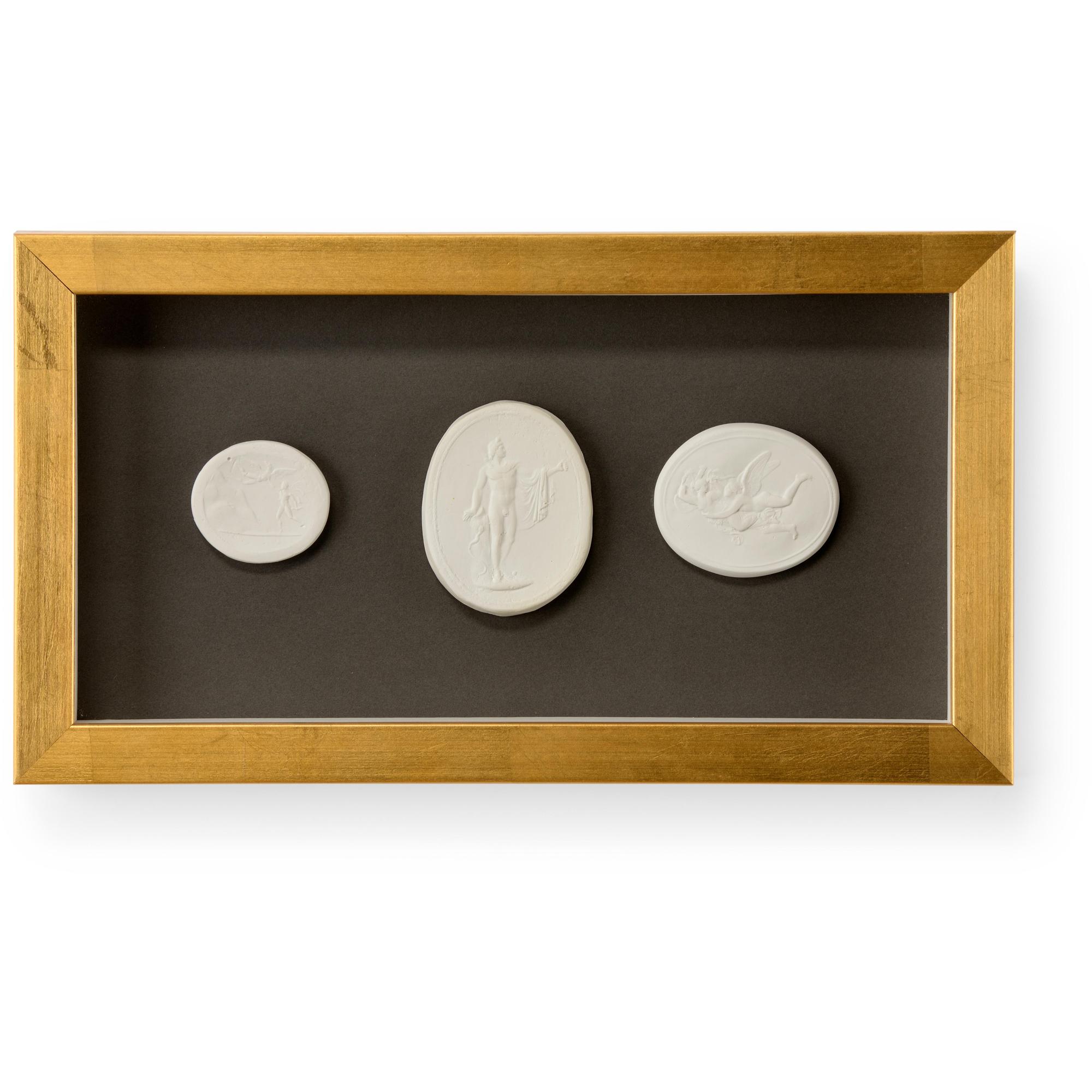 Intaglios on a charcoal background mounted under glass in contemporary gold leaf shadow box frame.