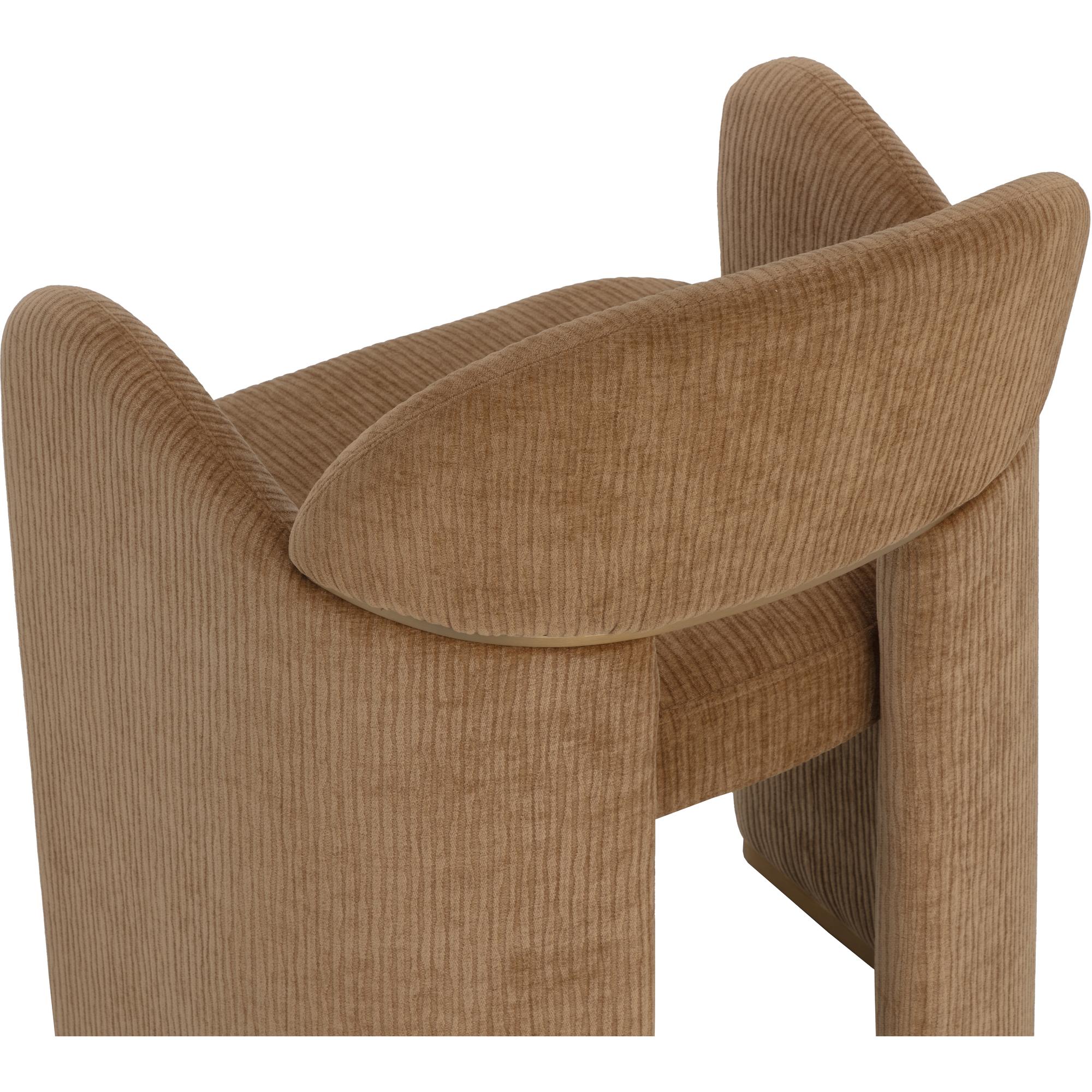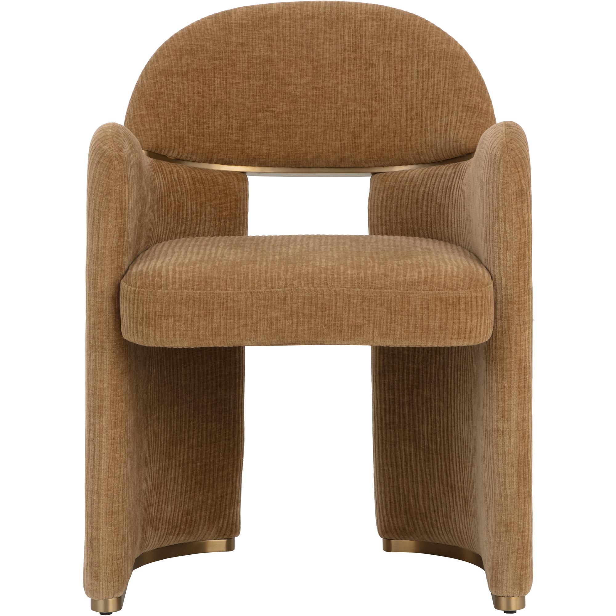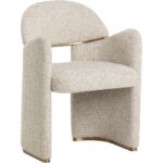 The Snowden Dining Armchair is a conversation starter. Textured opera butterscotch fabric, art deco curves, and soft angles create a unique, geometric silhouette that captivates from all sides. Gold metal inlay on the backrest and on the legs ties the modern look together.