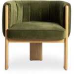 The Sofi accent chair brings contemporary design with vintage allure. An interplay of warm, 70s-inspired tones accentuate a bold sculptural, 3-leg design. Fold-over-like detailing on the arms of the chair expose the lustrous golden ash wood frame, while intricate upholstery channel detailing adds depth and texture to this inviting and nostalgic piece.