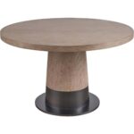 The Solara Dining Table showcases an intriguing two-tone aesthetic, blending the warmth of a White Oak finish with the cool, aged character of a Satin Pewter metal base. This rounded table harmoniously combines textures and hues, infusing spaces with a cool, dynamic vibe and a nod to mid-century design sensibilities.