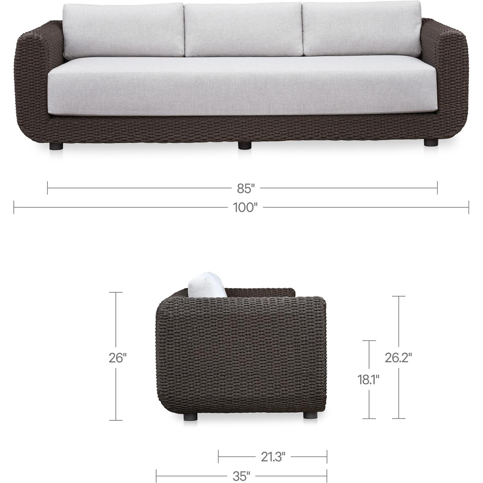 The Soma outdoor sofa finds a graceful interplay of form and purpose. Its dark brown finished PE synthetic wicker frame and sunproof, heathered Olefin fabric cushions exude poise and durability. Curved, playful arms and quick-dry foam invite relaxation while ensuring timeless panache.