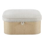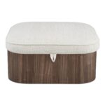 The Sonny ottoman elegantly articulates the luxury of simplicity with a walnut veneer base and a hydraulic lift top that unveils discreet storage. Upholstered in flecked oatmeal fabric, the plush seat contrasts the wood’s solid nature with piping that traces its contours. Curved corners soften the ottoman’s silhouette, creating a serene yet functional piece.