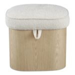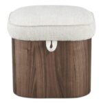 The Sonny stool elegantly articulates the luxury of simplicity with a walnut veneer base and a lift top that unveils discreet storage. Upholstered in flecked oatmeal fabric, the plush seat contrasts the wood’s solid nature with piping that traces its contours. Curved corners soften the stool’s silhouette, creating a serene yet functional piece.