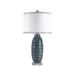Create a focal point in any room with the Spirea lamp. Adorned with an intricately carved pattern and a Prussian blue-glazed ceramic body, this lamp stands with a regal presence for all to admire. Topped off with an off-white linen drum shade that features classic blue trim and a sparkling crystal-clear finial, this table lamp is set to become the shining star in a bedroom, dining room, living room or entryway.