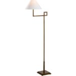 This sleek metal floor lamp features a modern silhouette with a bold square accent, adding a touch of architectural elegance. Finished in a rich aged brass, it exudes warmth and sophistication, making it a perfect statement piece for any contemporary or classic space. Designed by Jamie Merida.