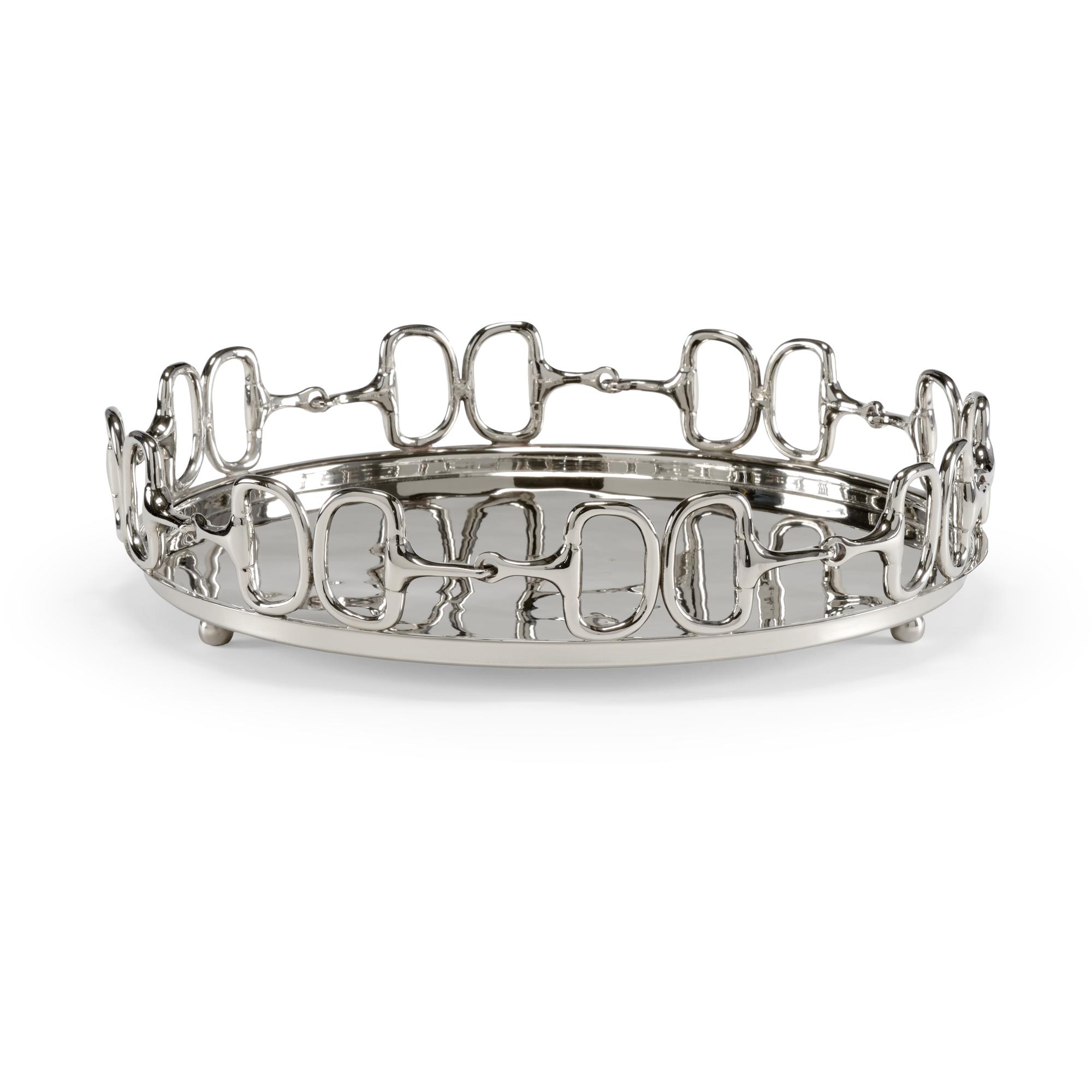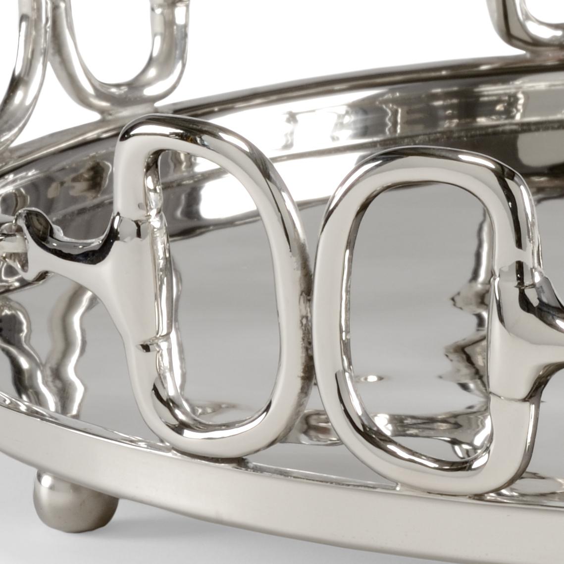 Featuring a round serving tray with d ring snaffle bits, stirrups tray is an ideal gift for the horse lover that also has a passion for entertaining. Crafted of cast brass with a polished nickel finish, this sleek 19″ diameter tray can also be used as a decorative accent in your home.