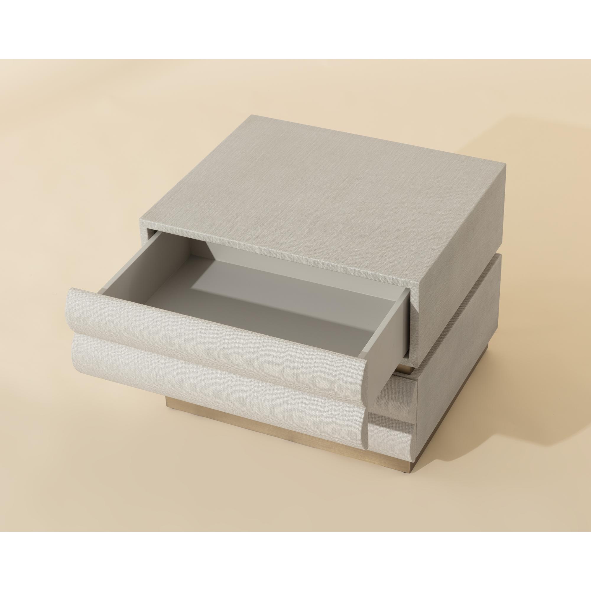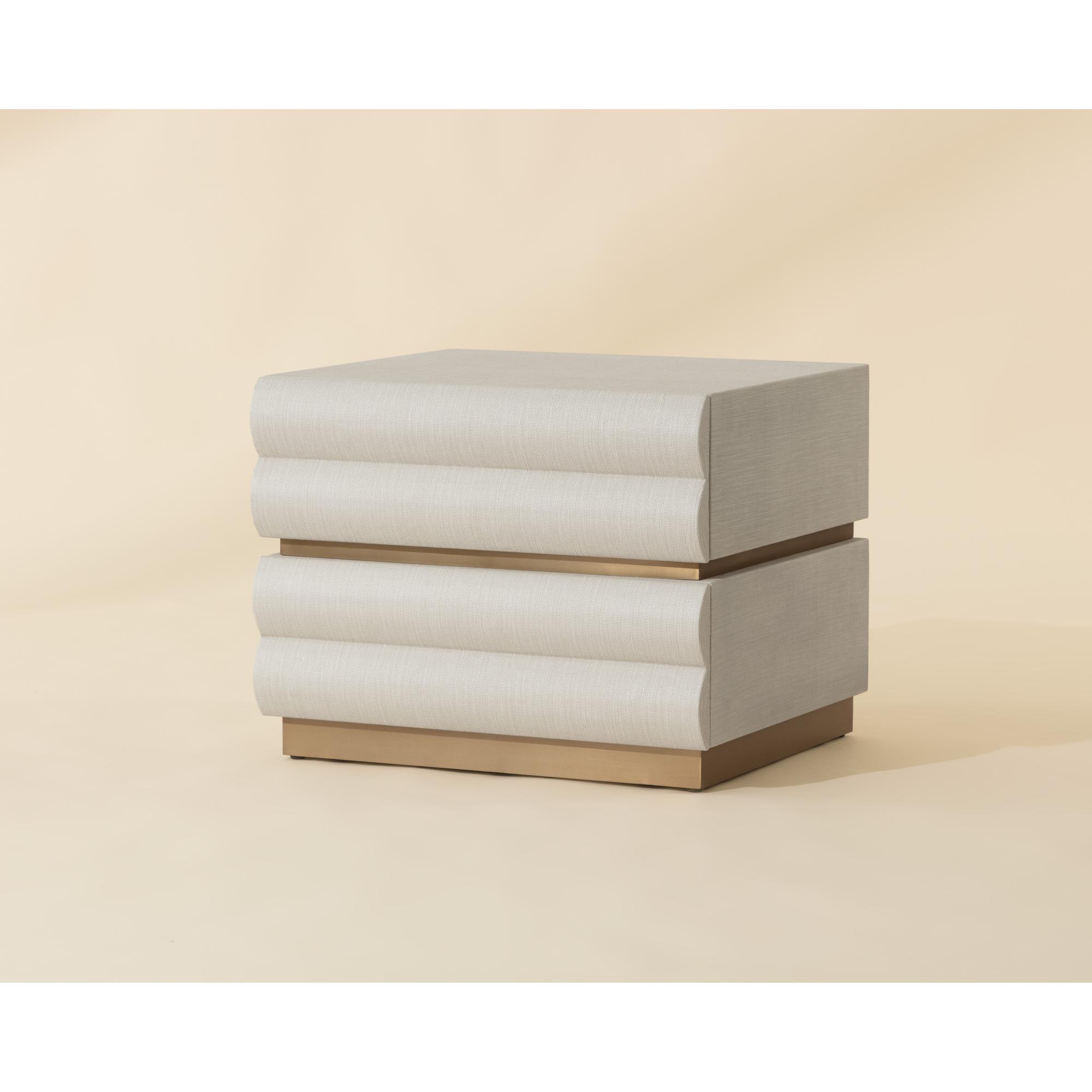 The Subira Nightstand brings sculptural detail to the bedroom with its tiered drawer fronts, crafted from rubberwood and wrapped in cream raffia for a textured finish. Resting on a golden stainless steel base, the design is elevated by a subtle metallic sheen. Its two spacious drawers open to reveal velvet-lined interiors, combining practicality with a tactile finish.