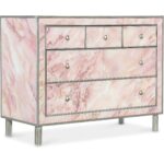 - Finish: Reverse handpainted glass in pink colors with silver legs and frame and silver finished round metal knob hardware