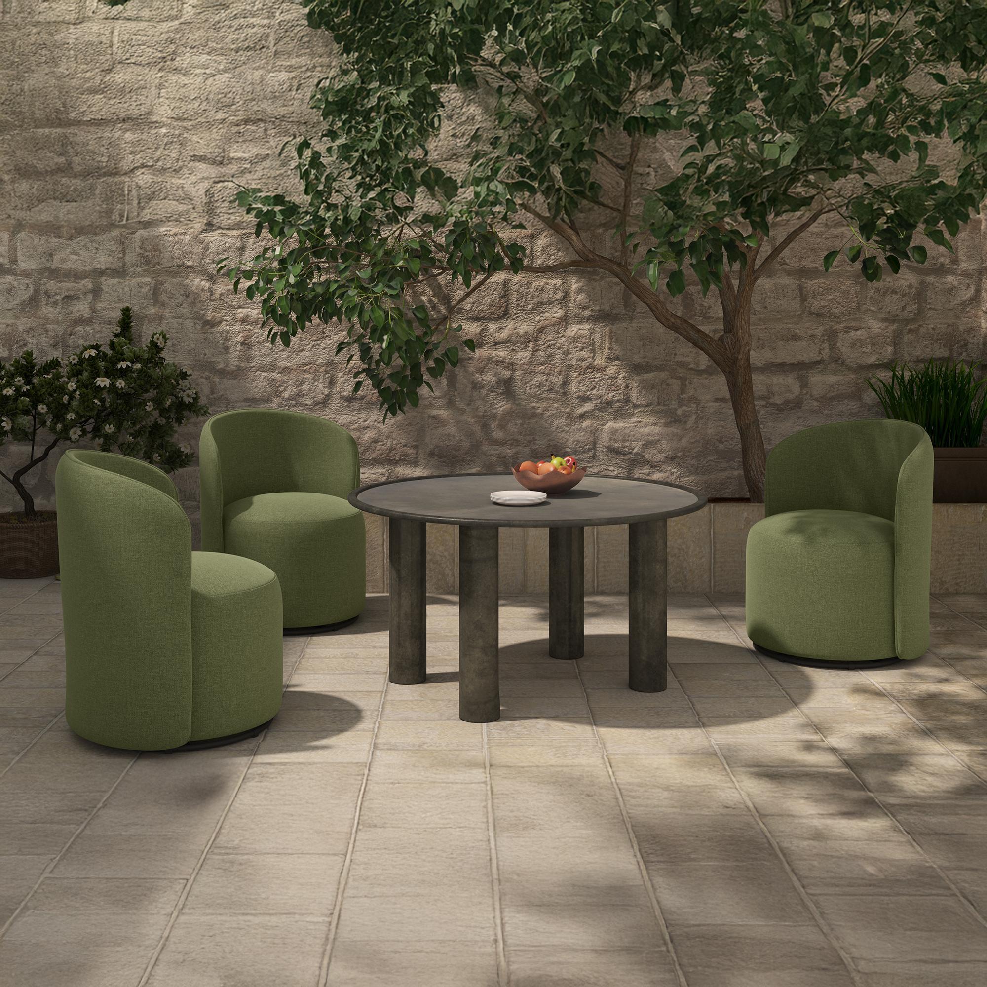 The Sylvie outdoor swivel dining chair harmoniously blends indoor comfort and outdoor practicality in alfresco dining. The sleek aluminum frame, quick dry foam, and Polypropylene fabric offer both durability and style. An innovative swivel base transforms dining experiences, allowing effortless engagement.