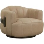 With its shapely silhouette and bolstered seating, the Tadeo Swivel Armchair takes comfort to a different level. A luxurious seat upholstered in our smooth vintage black night top grain leather sits atop an oak wood base. Matching wood detailing along the back of the chair with antique brass accents give a playful yet coordinated look to the design. Handle with Care: This design has been crafted with top grain leather. Leather is a natural material; as such, colour variation, markings, wrinkles, grooves and light scratches are acceptable and appreciated characteristics. No two pieces are alike. Visit our Product Care page for more information on how to ensure the lasting beauty of this piece. As wood is an organic, porous material, these pieces will contain natural variation of texture and may also exhibit fine indentations and cracks. Wood pieces will also display a disparity of colour and grain, and visible knots and burls that add to the character of each piece.