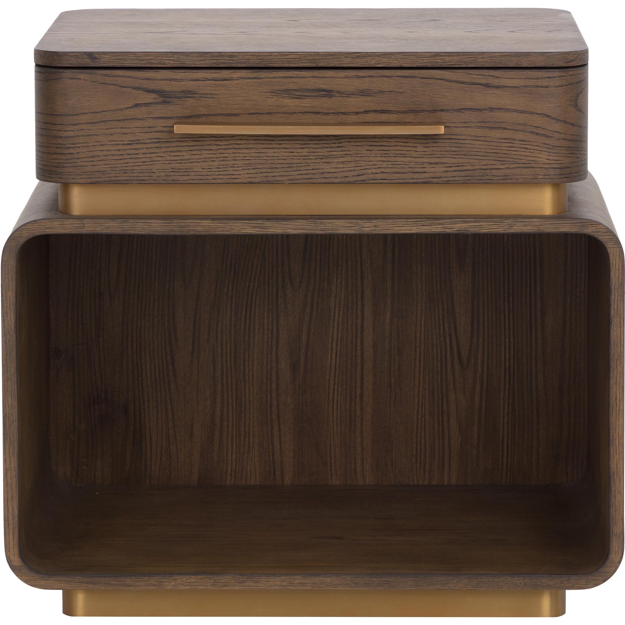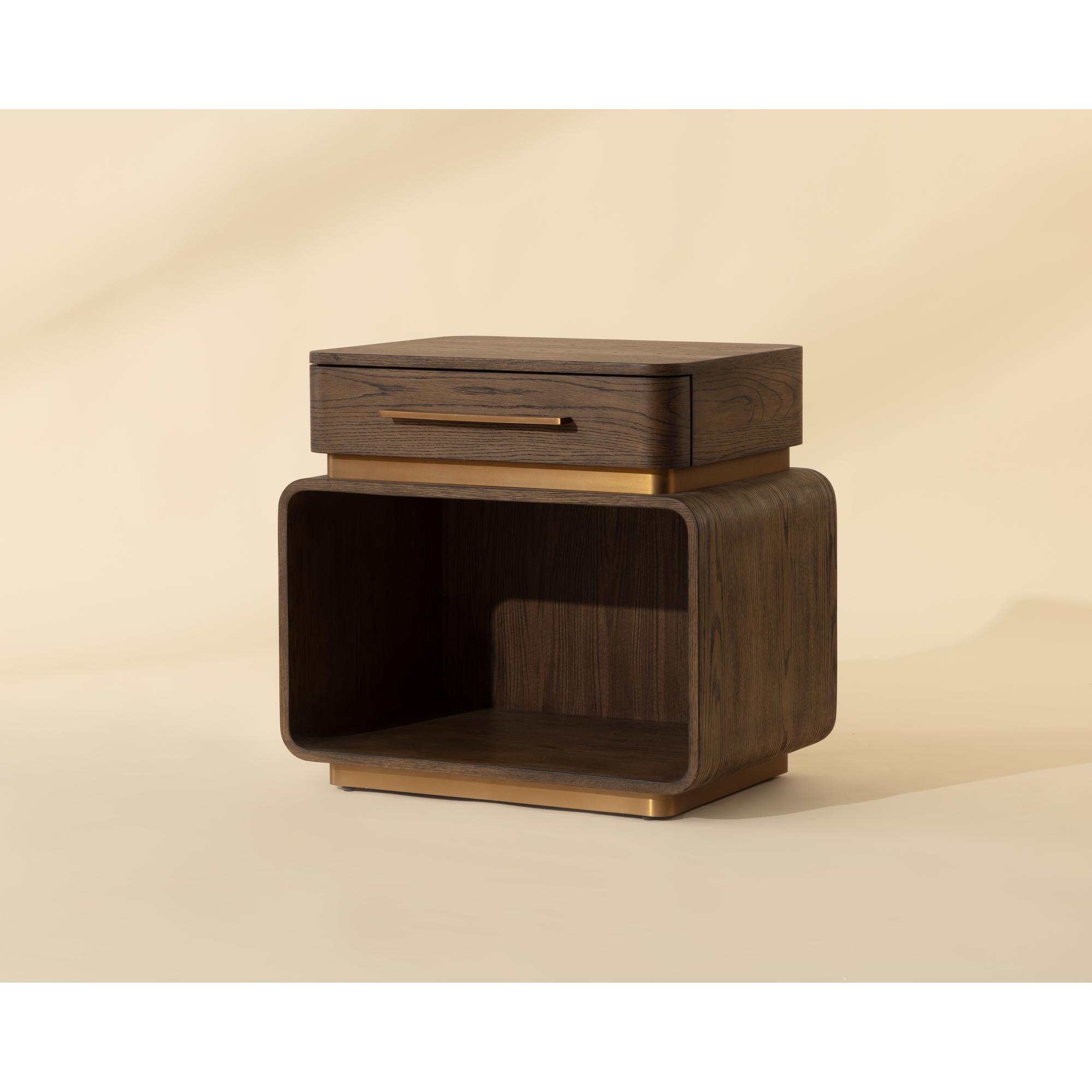 The Taro Nightstand lends an enigmatic form that reinvigorates any bedroom space. Crafted from solid oak wood with a chocolate finish, its rounded corners soften its geometric profile. A brushed gold base and matching handle introduce a warm contrast, while the open shelf and soft-close drawer offer both display and discreet storage.