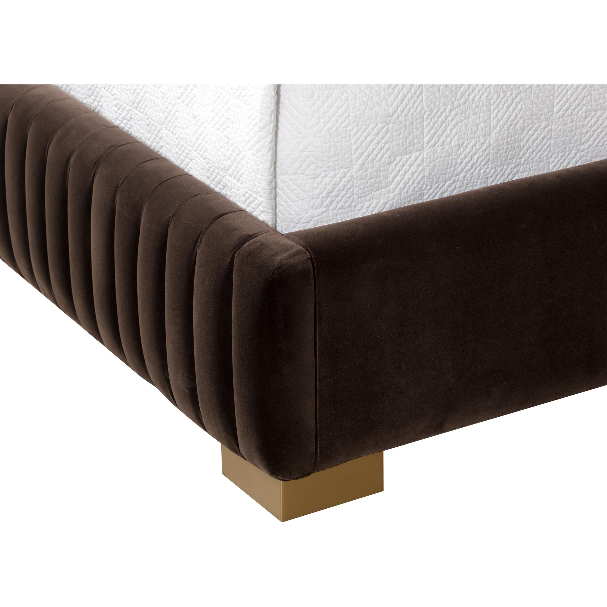 The Tarrant Bed is designed to make a statement. Featuring a large extended headboard in diamond mink fabric on brushed gold steel hardware. Vertical channel tufting on the front of the base and headboard adds visual intrigue to complete the piece.