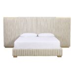 The Tarrant Bed is designed to make a statement. Featuring a large extended headboard in monument oatmeal fabric on brushed gold steel hardware. Vertical channel tufting on the front of the base and headboard adds visual intrigue to complete the piece. No box spring is required and slats are included.