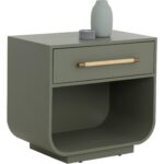 Fluid lines and gentle curves make up the modern silhouette of the Tarrant Nightstand. The raffia wrapped drawer handle adds an understated touch to the black oak veneer base.