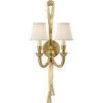 Tassel Twist Double Sconce brings a feminine flair to your existing decor. It’s warm antique cast brass tassel design features two lights with bone shades for ample illumination. Hang a pair on each side of a mirror for an elegant focal point over a console in your entryway or a vanity in your bathroom.