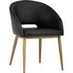 This compact barrel back dining armchair is effortlessly cool. Stocked in blush sky or deep green sky fabric with a black powder coated steel frame. Also available in antique grey faux leather with a black powder coated steel frame; or onyx and snow faux leather with a champagne gold frame.