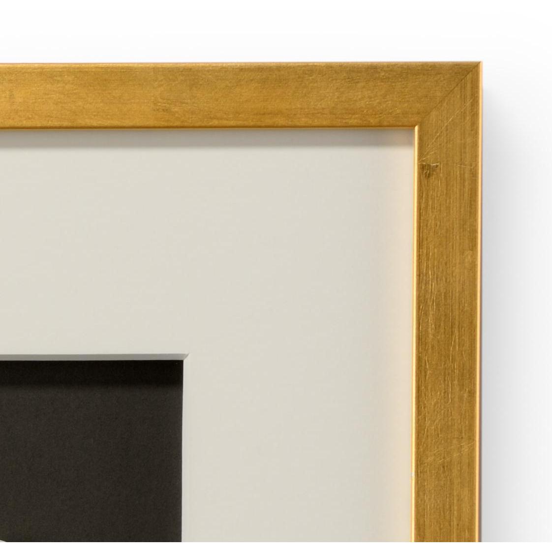 Intaglios on a charcoal background mounted under glass in a contemporary gold leaf frame with a six ply white mat.