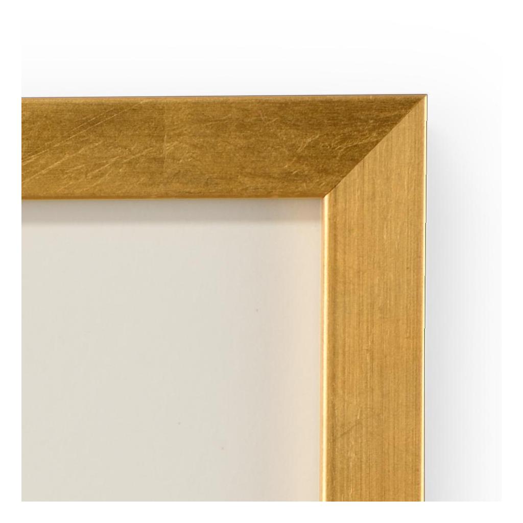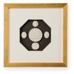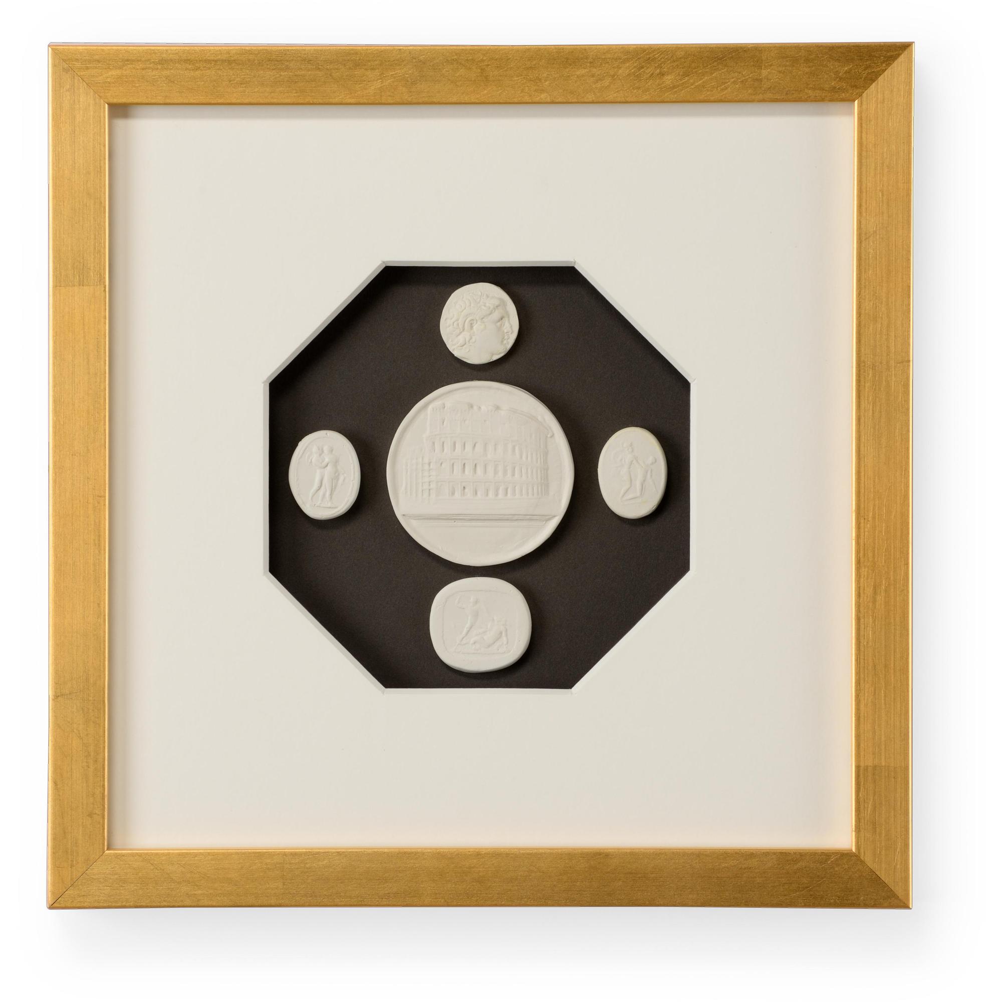 Intaglios on charcoal background mounted under glass in a contemporary gold leaf frame with a 6 ply white mat.