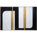This striking triptych in black, white and gold features a continuous graphic pattern that leads from one painting to the next. Features a gold finished wood floater frame. Each artwork is hand-painted and will feature slight variations that make every piece unique.