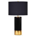 This black and gold contemporary table lamp brings a touch of Hollywood glamour to any interior. A solid black round shade is lined in gold, reflecting the colors in the base.