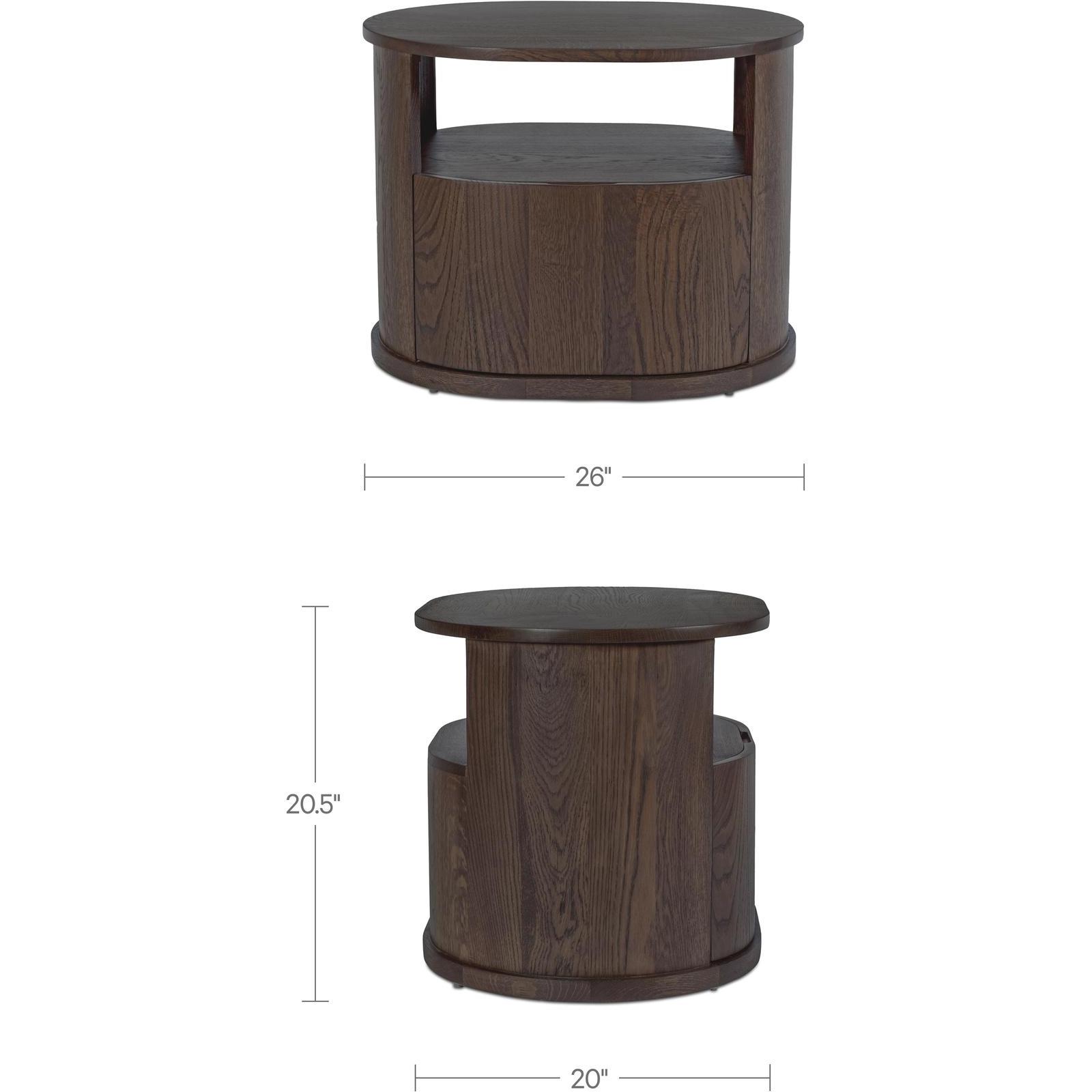 The Tommy nightstand embraces modern simplicity in rich dark brown. Its distinctive racetrack capsule shape adds a contemporary touch to the bedroom, seamlessly blending form and function. This nightstand features a solid oak frame with oak veneer details, offering durability and refined style. The soft-close drawer and open shelf provide versatile storage options in a piece that speaks to modern appeal.
