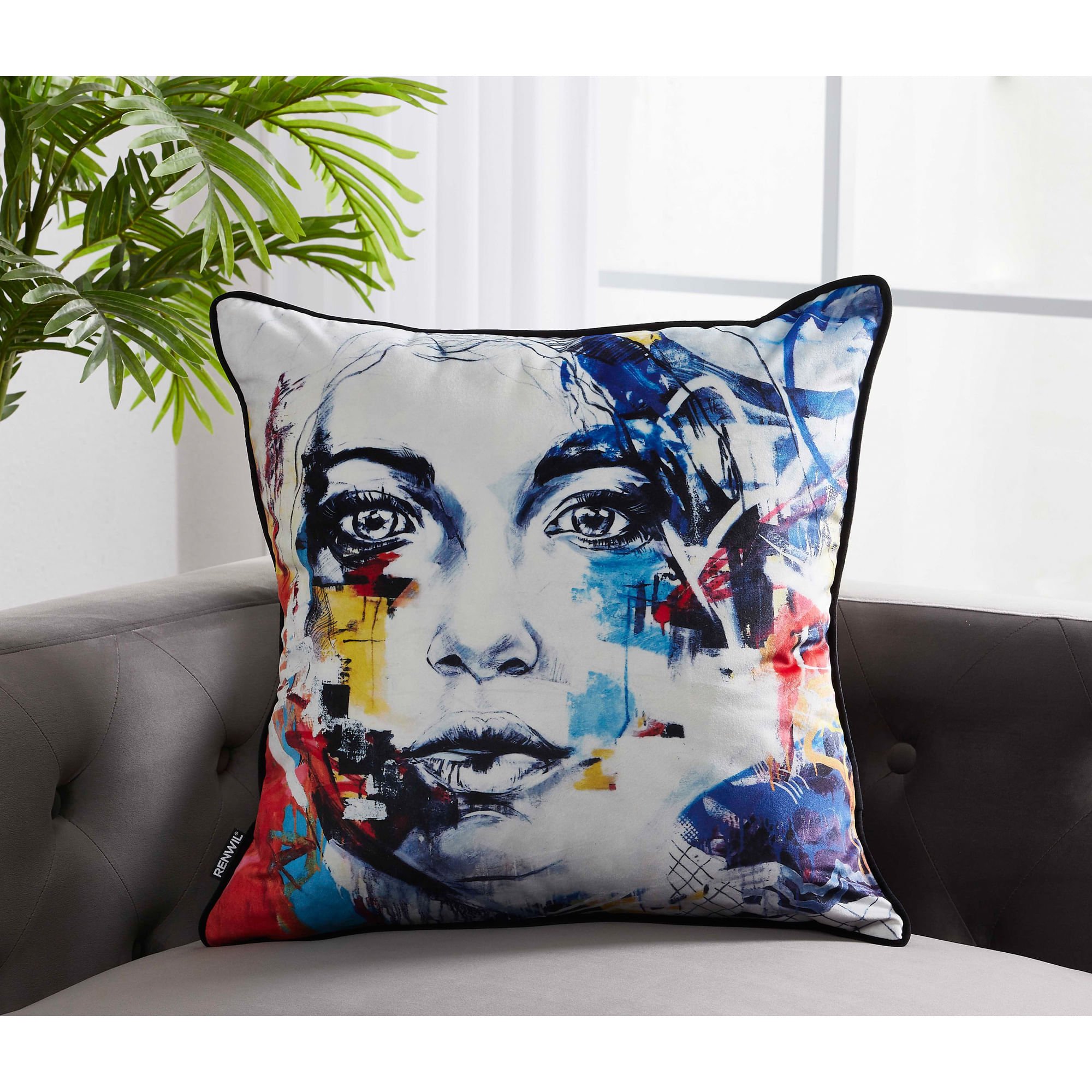 This captivating throw pillow design is a bold and exciting choice. While the portrait serves as the focal point on its velvet exterior, the intricate corners enhance its presence. Placed within the creative interior, it stands out in style.