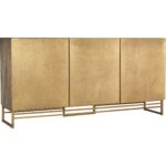 - Finish: Light natural finish on top, outside of case and interior. Doors are a textured gold-colored metal wrap. Gold metal base.