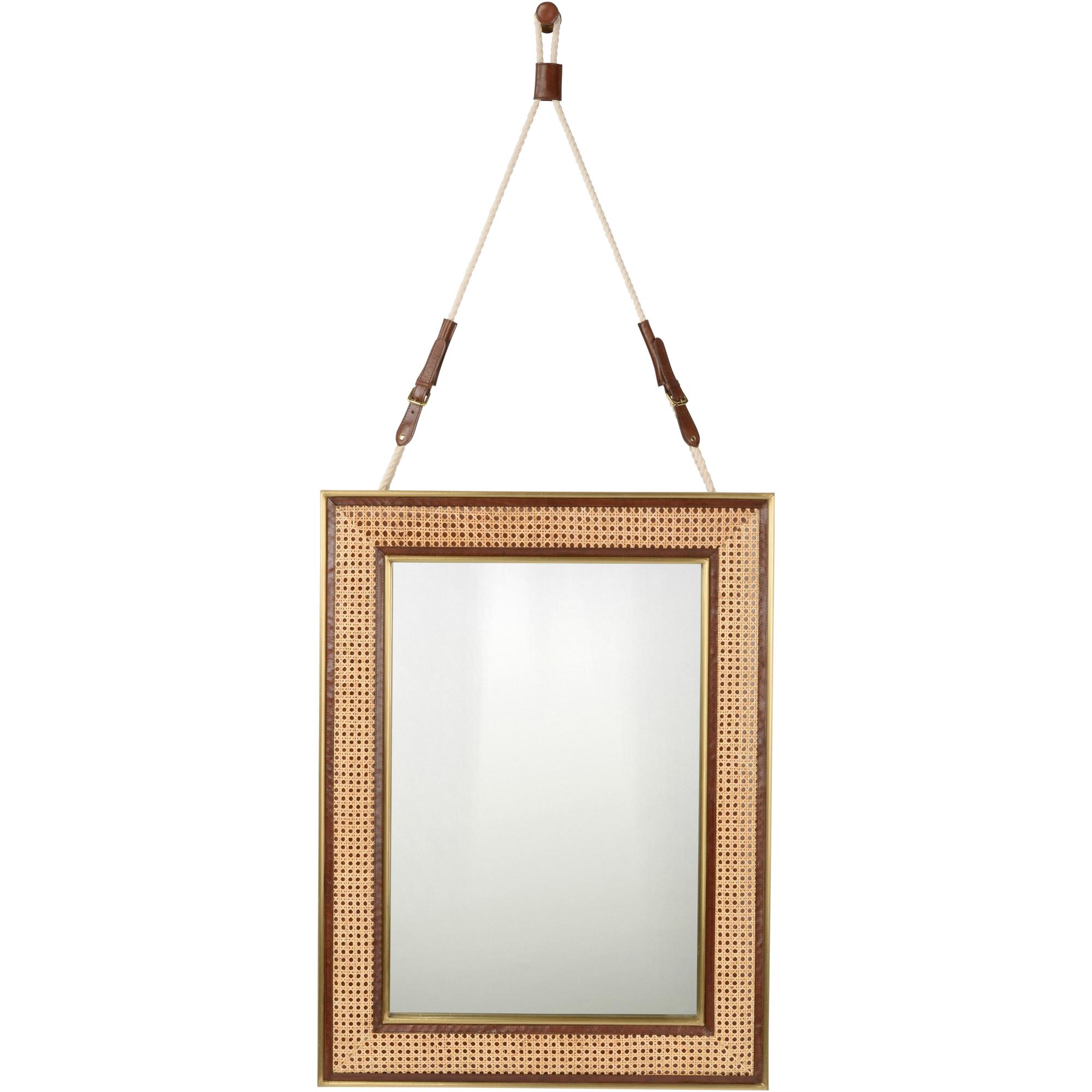 Add character to your home or office with this traditional woven cane and leather mirror. Its brushed brass trim provides a warm glamorous look to the design. The gentle juxtaposition of the various materials create a captivative waterfront design. Display vertically or horizontally in an entryway, bedroom or living area to add dimension to the space. Also includes nautical rope for vertical hanging.