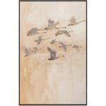 A symphony of motion captured in elegant simplicity, the Unison framed painting features geese in flight, set against a serene neutral backdrop. Art Deco inspired, and meticulously crafted with acrylic on canvas, each brushstroke contributes to the sense of forward movement.