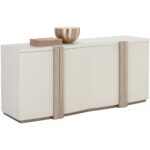 Spacious and stylish, the Venetta Sideboard will elevate any space. Smooth light oak wood handles beautifully complement the cream base and reeded front doors. As wood is an organic, porous material, these pieces will contain natural variation of texture and may also exhibit fine indentations and cracks. Wood pieces will also display a disparity of colour and grain, and visible knots and burls that add to the character of each piece.