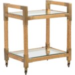 Move the party from room to room with our Vieux Carre Bar Cart. Featuring natural, woven cane with bronze corner brackets, its two glass shelves hold bottles, glassware, your favorite decorative accents and more. Casters allow you to transport snacks with ease. Reflect your modern, coastal style by displaying this versatile piece in a kitchen, home bar or entertaining area.