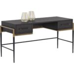 Make a statement with this stylish desk that exudes prestige. Features a oyster acacia wood veneer with two soft closing drawers. Completed with black and antique brass iron handles with coordinating base.