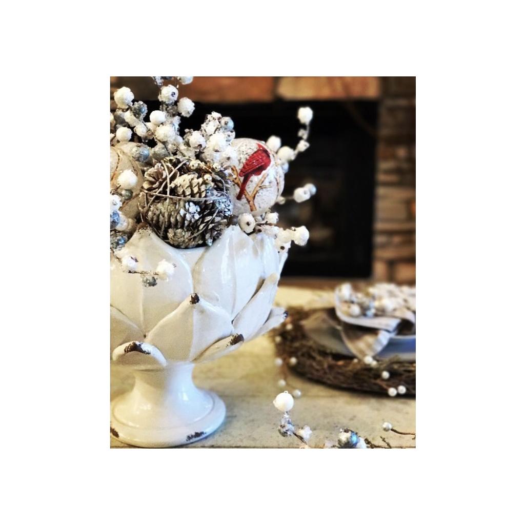 Create a centerpiece for your table by adding a dried arrangement, fruit or decorative orbs to this contemporary bowl. he White Leaf Vase is a worn white hand glazed porcelain artichoke design with a pedestal base that is adaptable to any design style.