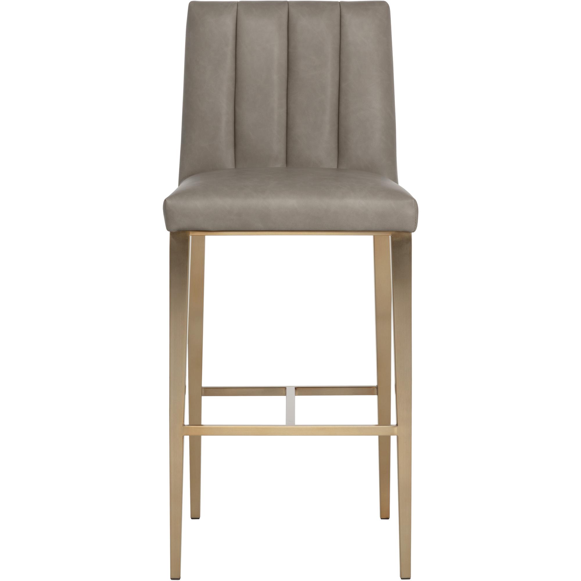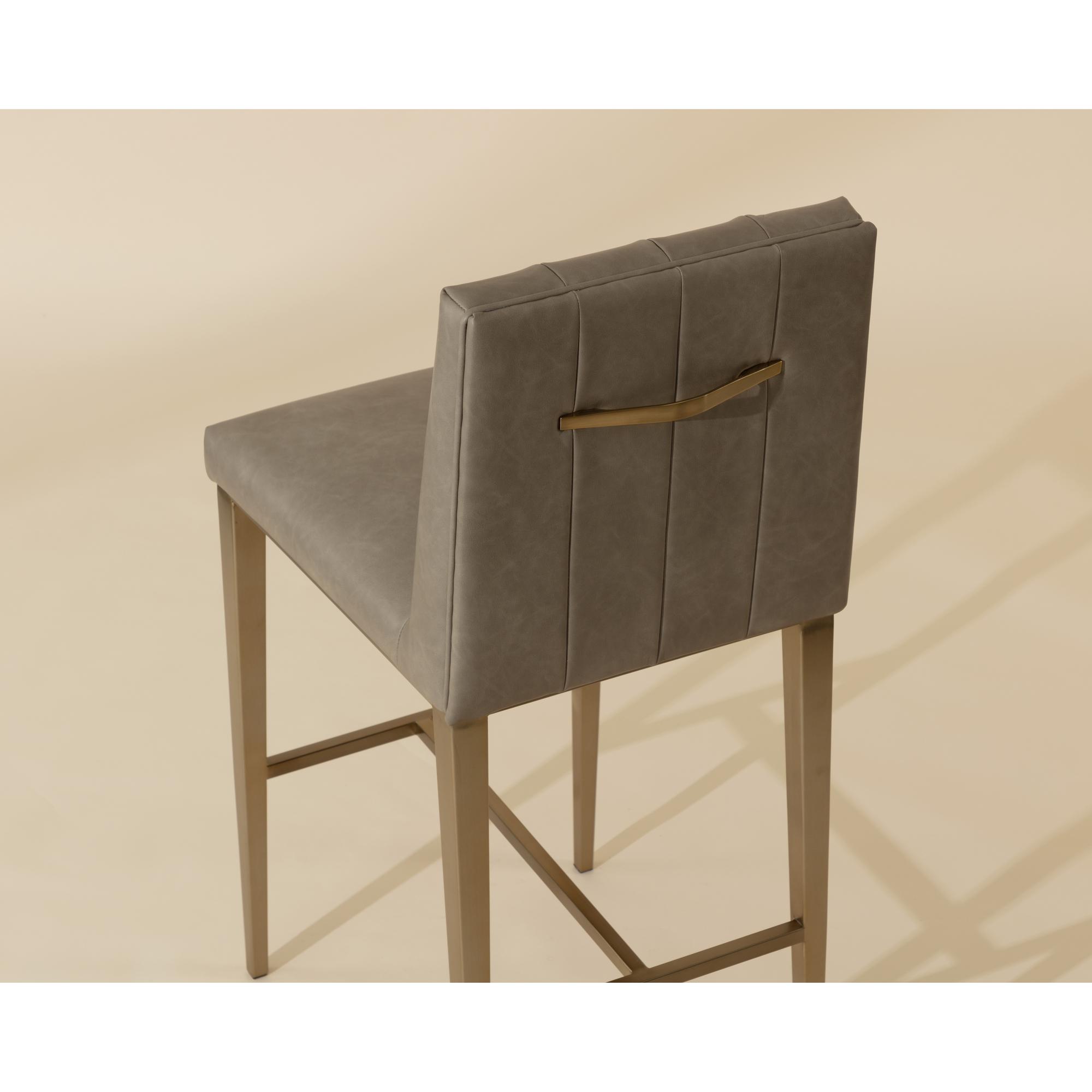 Minimal and classic best describes the Wilbur Barstool. Upholstered in ivanhoe mineral faux leather with vertical channeling on the back seat for added flair. Finished with powder-coated stainless steel legs and a matching decorative handle.