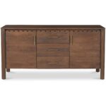 Modern aesthetics effortlessly blend with the refined simplicity of traditional Shaker design in the Wiley 3 drawer sideboard. Meticulously crafted, its elegant form is defined by sleek, geometric curves that add a captivating touch of modernity. The post legs stand as pillars of strength, grounding the sideboard with their understated presence. A showcase of intricate scalloped edge details and heavy brass handles, these delicate elements lend a timeless charm reminiscent of classical influences.