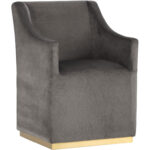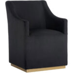 An eye-catching, ultra glamourous wheeled lounge chair. Stocked in our piccolo prosecco performance fabric with a brushed brass steel frame. Sophistication and comfort fit for various dining and lounge spaces. Performance fabric is moisture repellant, durable and easy to clean.