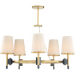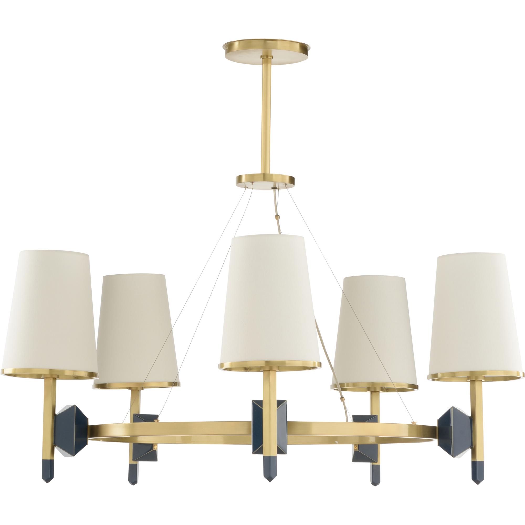 Add sophistication to any living space with the Zuri Chandelier. This antique brass chandelier features classic lines with unique geometric shaped connections that provide a modern and refined look. Its antique brass finish with pops of blue provides a sense of calmness and serenity to any room. Comes with 1 – 9″ rod and 2 – 12″ rods.